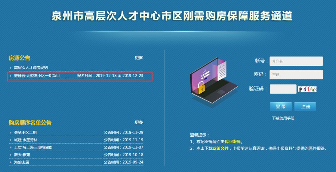 近日,福建日报新媒体·闽南网记者从泉州市高层次人才中心市区刚需购房保障服务官网了解到,碧桂园天玺湾小区一期项目高层次人才房源信息已公布,总共18套,房源价格区间10934-12920元/㎡。报名时间为12月18日-23日。