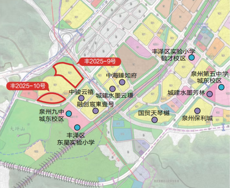 4.丰2025-9号地块东南侧约300米已规划在建泉州市第九中学城东校区,东南侧约400米已建设泉州市丰泽区东星实验小学。关于学区划分事宜,需待当年度片区摸底生源数,并结合新建学校投用情况后确定,具体以当年度丰泽区的招生政策为准。