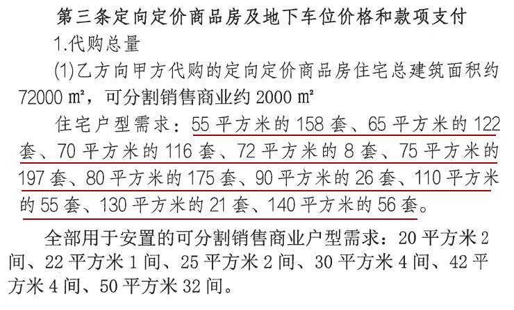 根据该地块代购协议来看:建成后定向定价商品房、配套商业、地下非人防车位由泉州市鲤城区地产开发有限公司代购,代购的定向定价商品房建筑面积约72000㎡,配套商业建筑面积约2000㎡,非人防地下室标准车位全部代购。